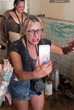 10 a.m. - Alex got us out of bed with his big excitement. “Swingers time!” Irma is sharing her dream with us about swingers; she would love to swing with girls, kissing, touching, rather than with boys. She said that she already feels horny. She admitted that she would lick pussies and maybe even ass. Let’s go and see what today brings. This room has two areas. One is reserved for voyeurs who are naked or half-dressed, but they are already touching themselves and masturbating. The other is packed to the roof with a crowd of people on top of each other. Men and women, of all ages, are moaning, naked, touching each other. Irma already adores the green pussy hair of one of the girls. A dirty receptionist is walking in the crowded room, making sure that everyone interacts.